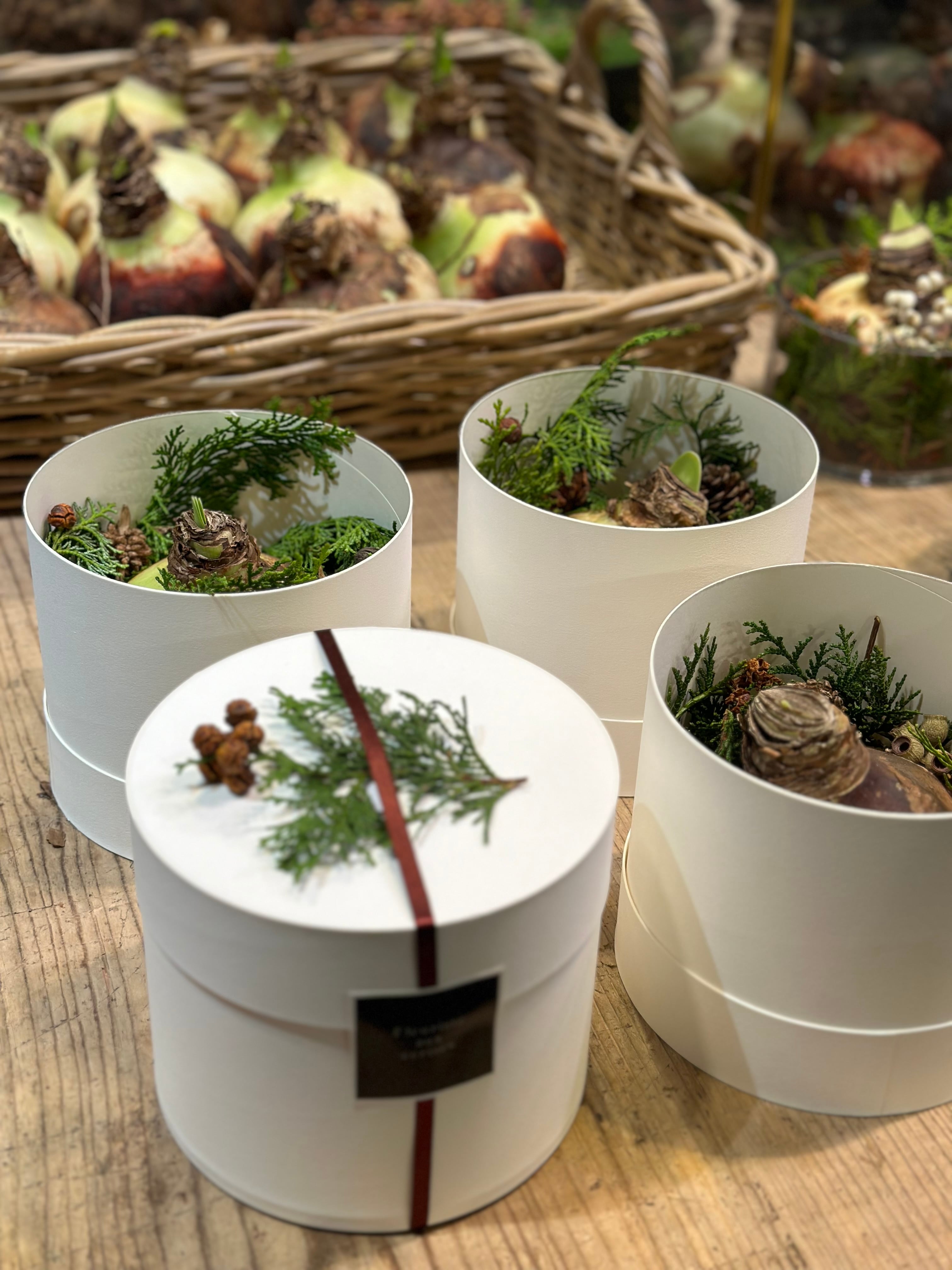 白八重咲きのアマリリス球根が1球、素敵なギフトボックスに入っています。ヒバや木の実、シナモンなどがアレンジされており、フワッと広がる香りも楽しめます。